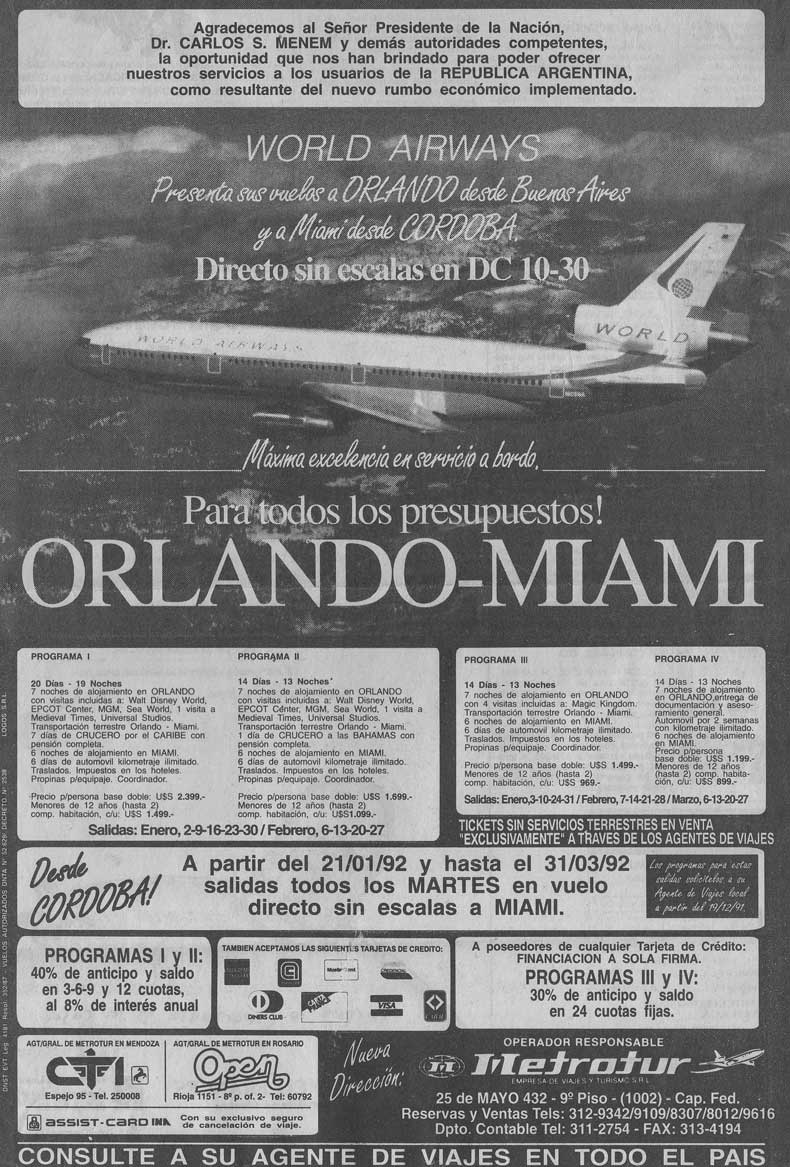 El aviso publicado en La Nación del 15 de diciembre de 1991 ofrece viajes a Miami y Orlando con vuelos charter desde Buenos Aires. Como se observa, tambien existió la posibilidad de volar desde Córdoba (imagen: archivo Pablo Luciano Potenze).